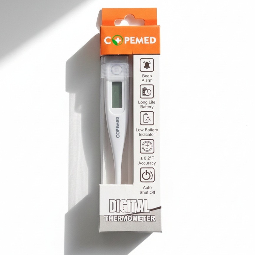 COPE MED Digital Thermometer for quick and precise temperature reading. Features a Beep Alarm, Long Life Battery with a Low Battery Indicator, high accuracy of and Auto Shut Off for convenience. Perfect for home use.