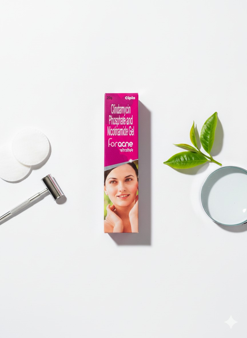 Foracne Gel by Cipla combines Clindamycin Phosphate and Nicotinamide to effectively treat acne, pimples, inflammation, and redness. This dual-action formula helps reduce bacterial growth, controls excess oil, and promotes clearer, smoother skin. Suitable for daily use as prescribed by a dermatologist.